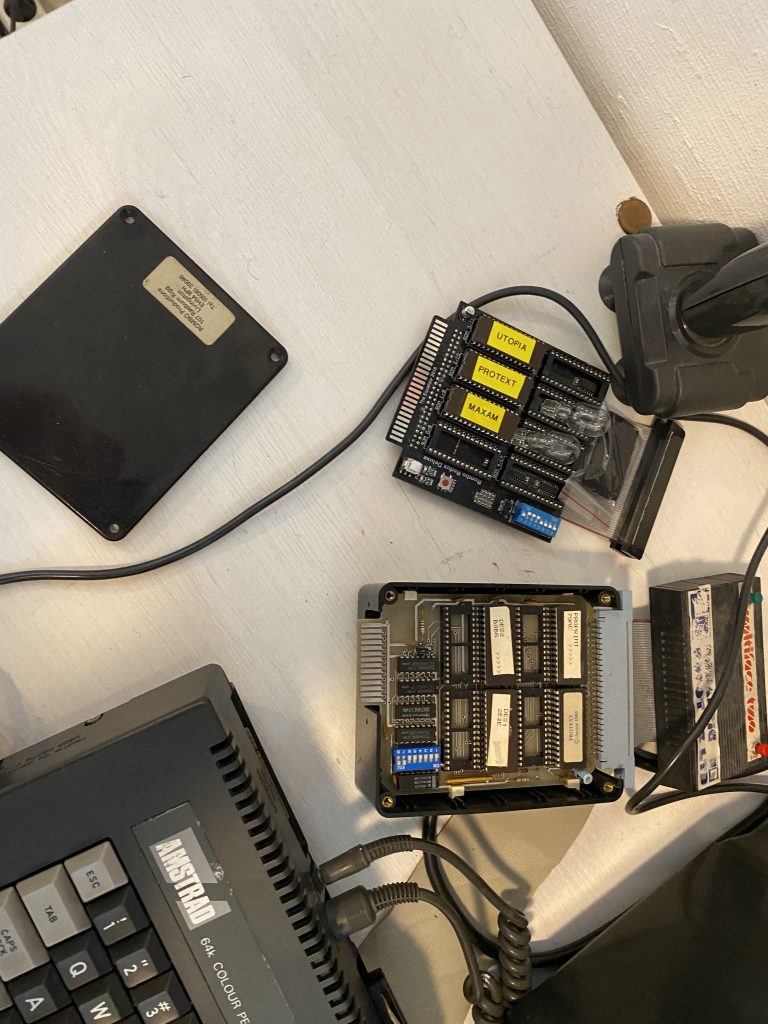 On top of one of the desks and connected to the CPC 464 I have an original Rombo Rombox with some roms (Protext/Proprint), and a newer rombox with some other useful roms such as MAXAM (assembler/disassembler).