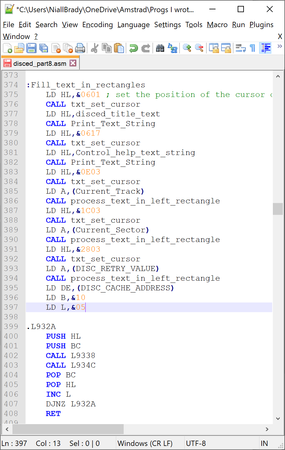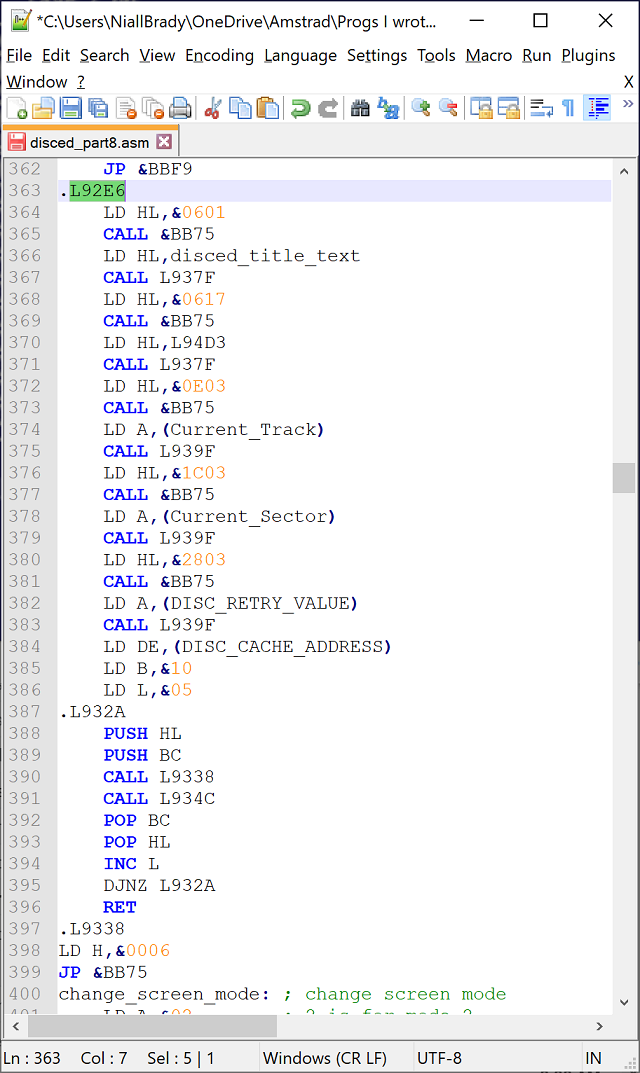 Next, I decided to add the Amstrad firmware calls used in Disced to the top of the assembly, that way the code will become easier to read. For example call &bb75 will become call txt_set_cursor. I’ll try and convert each firmware call I can find in the assembly to it’s readable label over time.